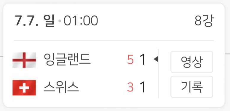 8강 마지막 경기는 잉글랜드와 스위스의 경기입니다. 대회 전 우승후보로 가장 많이 거론되던 팀인 잉글랜드. 막상 대회가 시작되자 화려한 멤버에 비해 그렇지 못한 경기력으로 이런저런 말들이 참 많았지만 계속해서 승리하며 탈락하지 않았는데요. 이번 경기도 같은 평가가 많은 경기력을 보여주었지만 스위스를 승부차기 끝에 누르며 잉글랜드가 4강에 진출했습니다. 좋은 폼을 보여주며 스위스를 이끌던 주장 아칸지의 실축이 아쉬웠습니다.(아칸지 외에 양팀 모든 선수들이 페널티킥을 성공시킵니다.) 안보길 참 잘했다는 생각이 드는 댓글들이 많았는데요. 양팀 모두 1골도 넣지 못한 채 승부차기까지 갔으니 승부차기만 보는 것도 추천드립니다. 경기력에 비난을 많이 받고 있는 잉글랜드이지만 경기력이 어떻든 살아남은 자가 강한 것 아닐까 싶습니다.